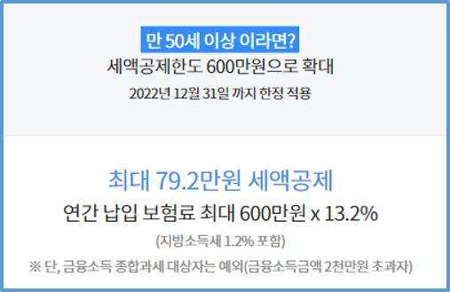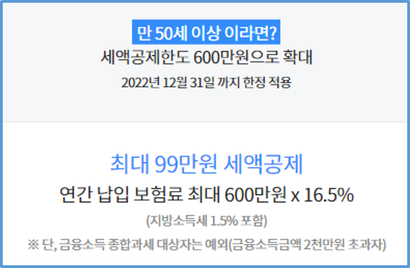 즉, 만 50세 이상인 경우에는 세액공제가 적용되는 최대금액이 기존 400만원에서 600만원으로 증가하여 연간 최대 99만원의 세액공제 (세금환급) 혜택을 누릴 수 있습니다. (단, 2022년12월31일까지)