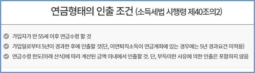 연금 수령시 낮은 연금소득세율을 적용받기 위한 세부 조건은 아래와 같습니다.