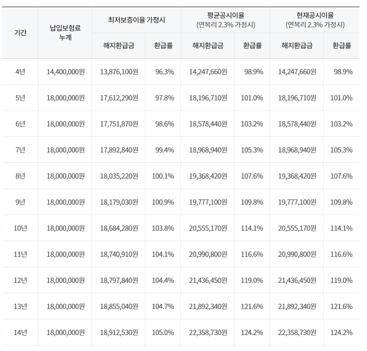 현재 또는 평균 공시이율로 수익률이 적용된다하더라도, 5년안에 해지하면 원금도 다 찾지 못합니다.