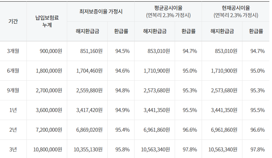 다음은 연금저축보험의 해지 환급률 예시입니다.