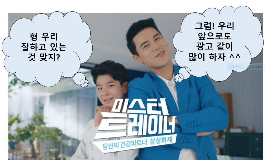 삼성화재의 광고 컨셉은 '당시느이 건강파트너 미스터 트레이너' 라는데요, '건강파트너송' 과 '건강댄스'를 광고를 통해 선보였습니다.