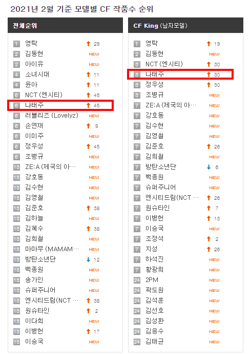한국 광고총연합회에서는 매월 CF 광고 제작수 기준으로 남여 연예인별, 그리고 남녀 합산 기준 순위를 발표하는데요, 나태주는 2021년 2월 기준으로 남자 CF 모델 순위 3위에 오르는 기염을 토했습니다.