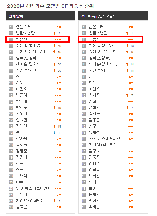 2020년 4월 모델별 CF 작품순위를 보면 백종원은 당당히 1위를 차지하였는데요, 백종원과 나란히 1위를 한 모델을 보면 한국이 낳은 세계 최고 인기아이돌 방탄소년단과, 그 방탄소년단의 일원인 랩몬스터가 함께한 것을 알 수 있습니다.