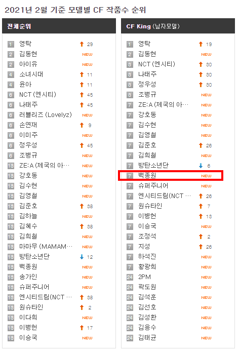 연예인들은 광고를 찍는 달고 있고, 찍지 않는 달도 있기때문에 항상 매달 상위권에 링크되지는 않는데요, 백종원은 꾸준히 순위에 올라와 있습니다.
