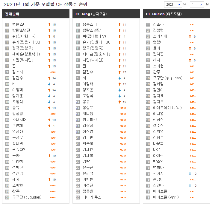 2021년 1월 광고제작수 순위를 보면 영탁이 1위는 아니지만, 그래도 상위권인 공동 20위에 랭크된 것을 알 수 있습니다.