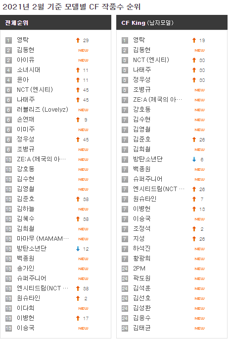 인기 트롯트 가수 영탁이 2021년 2월 기준으로 CF 를 가장 많이 찍은 광고모델로 등극하였습니다!!