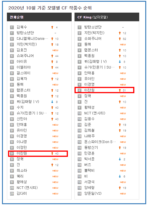 광고 CF 제작수 기준 상위 모델기록을 검색해보면 2020년부터 2021년 4월까지 이찬원이 상위30위 순위에 들어온 경우는 2020년 10월 한번 뿐입니다.