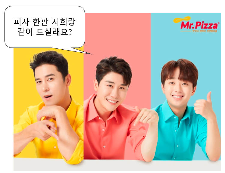 요즘과 같이 배달중심의 외식업이 뜨는 상황에서 가장 핫한 아이템중 하나인 피자광고를 찍은 것인데요, 셋이 같이 찍어서 그런지 미스터피자 브랜드 이미지가 확 다시 살아나는 것 같은 느낌이 듭니다.