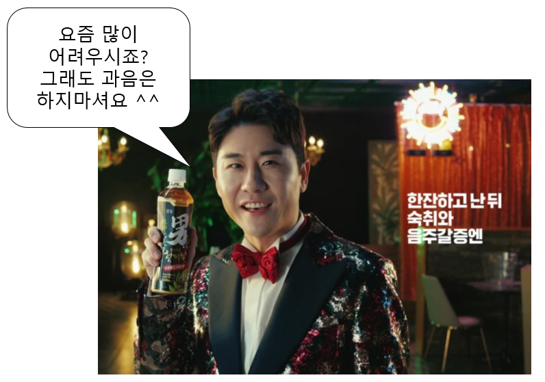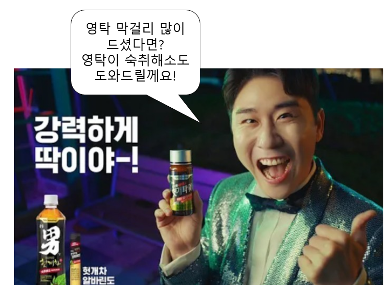 광동제약은 "숙취와 음주갈증 해소를 한 번에!" 라는 컨셉으로 헛개차, 헛개파워와 같은 숙취관련 상품 광고를 제작했는데요, 영탁의 히트곡인 '니가 왜 거기서 나와' 노래에 맞춰 음주 중, 음주 후의 상황들을 재미있게 담아 영상광고를 만들었습니다.