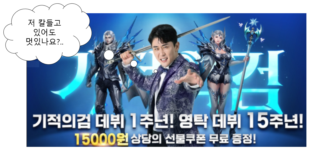 다만, 한 가지 아쉬운 점은 기적의 검이라는 게임 출시 1주년을 영탁 데뷔 15주년과 엮어서 광고를 만든 점인데요, 보는 입장에서는 다소 생뚱맞은 부분으로 느껴지긴 했습니다.
