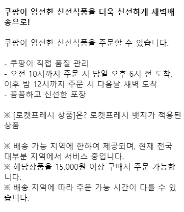 다만, 쿠팡의 다른 서비스들 (로켓배송, 로켓프레시 등등)과 같이 배송이 가능한 지역이 있고 배송이 되지 않는 지역도 있습니다.