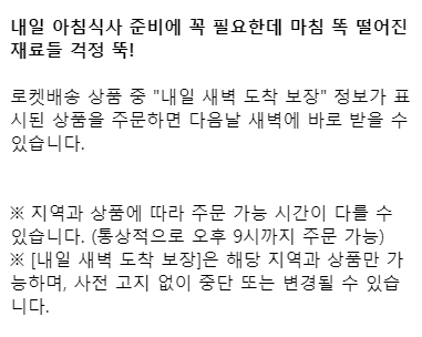 새벽배송이 가능한 일반상품들도 로켓프레시 상품처럼 아래 예시그림과 같이 "새벽 도착 보장" 이라는 표시가 나옵니다.