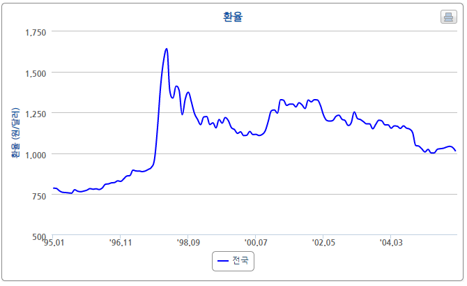 1995년 달러당 750~780원 수준으로 안정적으로 움직이던 환율은, 1996년 부터 급격하게 상승하기 시작합니다.