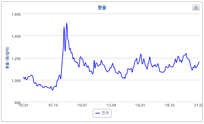 그 이후 2016년 1~2월에 1,200원을 좀 넘는 환율을 유지하였고, 이후 다시 2년간 하락하여 2018년 2~5월에 1,060원~1,080원 수준의 환율을 기록하기도 하였습니다.