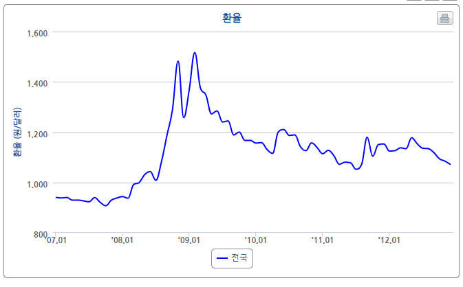 그런데, 2008년 5월 1,000원을 쉽게 돌파하더니 이후 지속적으로 급상승하여 2009년 2월에는 1,500원을 훌쩍 넘기고 나서야 안정되기 시작했습니다.