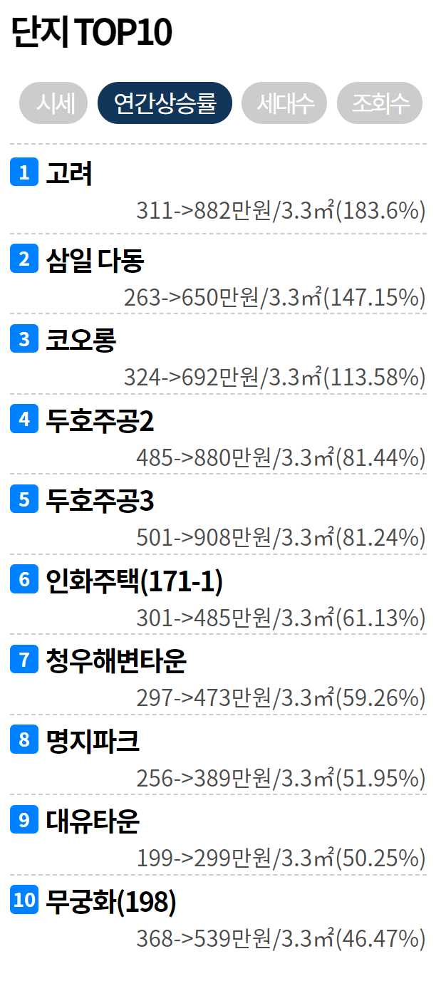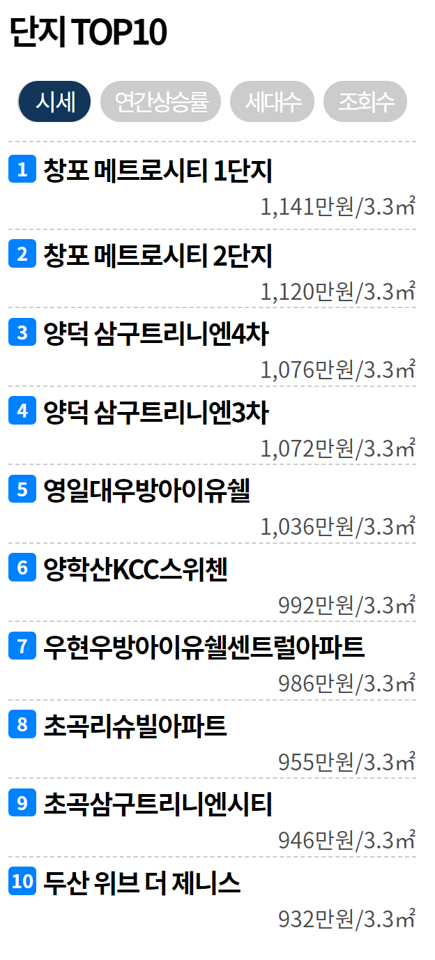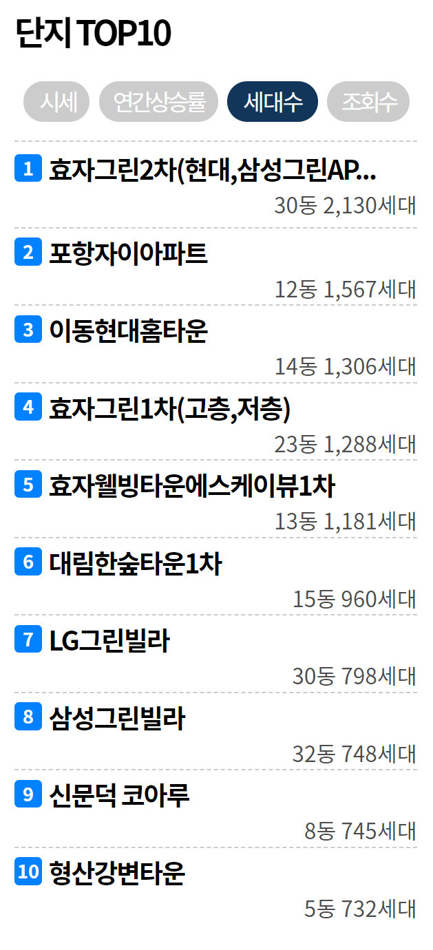 1. 포항 아파트 매매 시세, 연간상승률 및 세대수 Top 10.