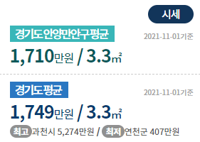 안양은 동안구와 만안구로 나뉘어지는데, 다음에서 보는 바와 같이 동안구의 평균 아파트 시세가 만안구대비 압도적으로 높습니다.