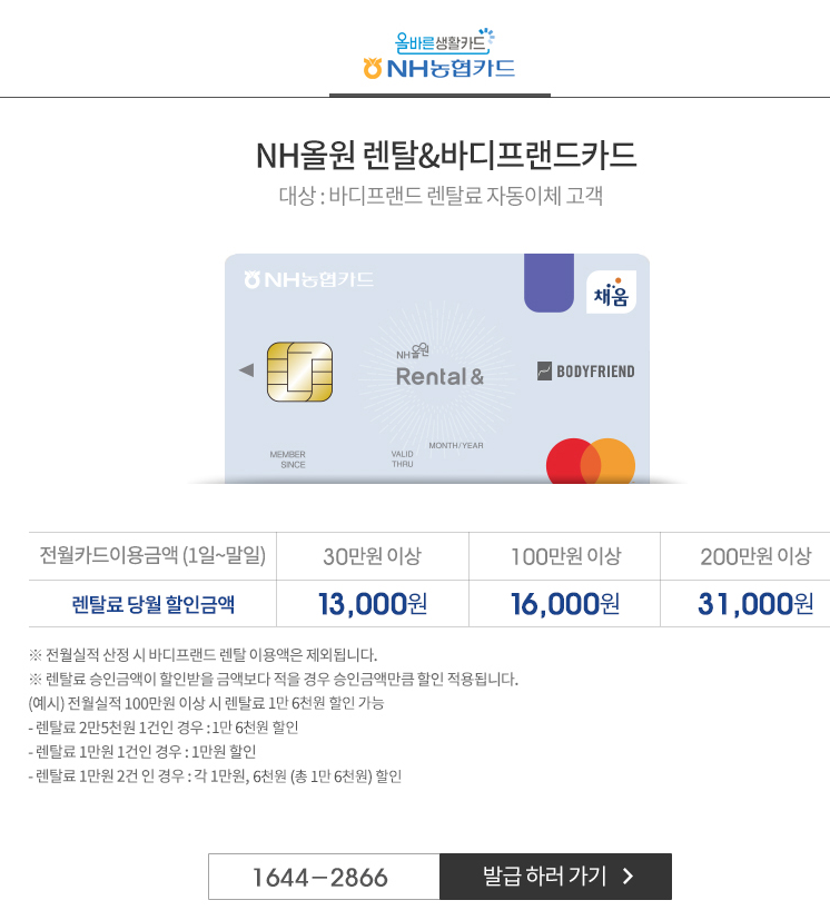 카드 사용액이 많으신 분들은 그냥 바디프랜드 반 값에 렌탈한다고 생각하고 NH 농협카드 하나 만들어서 사용해 보셔도 좋을 것 같습니다!