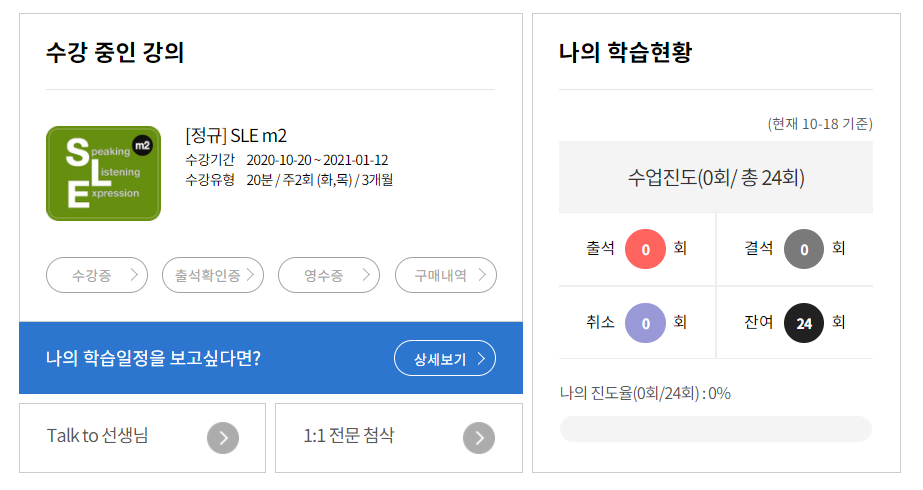 그리고 수업시간은 10분, 20분 이렇게 선택할 수 있는데, 저는 20분 수업으로 진행하고 있습니다.