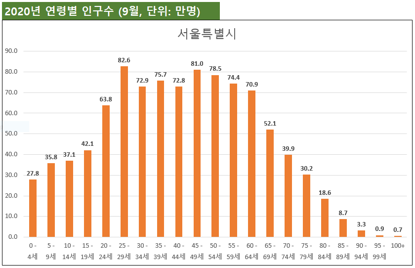 2020년 서울시에서 가장 연령이 많은 인구는 25~29세로 82.6만명을 차지하고 있습니다.
