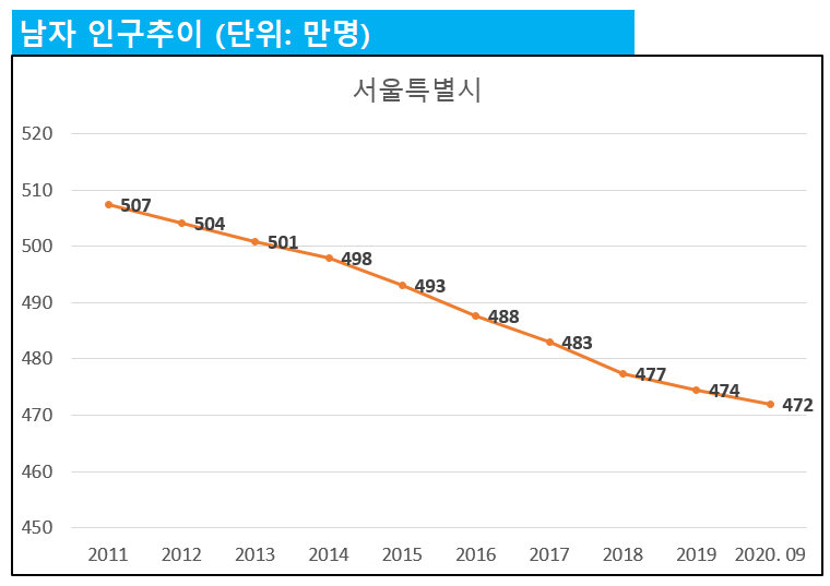 2011년 507만명이었던 서울시 남자인구는 2020년 9월 472만명까지 감소하였습니다.