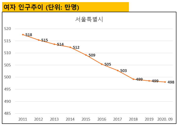 2011년 518만명이었던 서울시 여자인구수는 2020년 498만명까지 감소하였습니다.