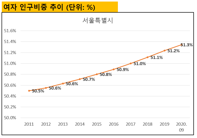하지만 서울시 여자인구수 비중은 그 절대수의 감소에도 불구하고 계속 증가하여, 2011년 50.5%에서 2020년 51.3%까지 증가한 상황입니다.