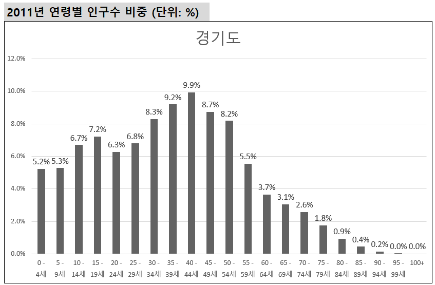 (2) 경기도 2011년 연령별 인구수 추이 및 인구 비중.