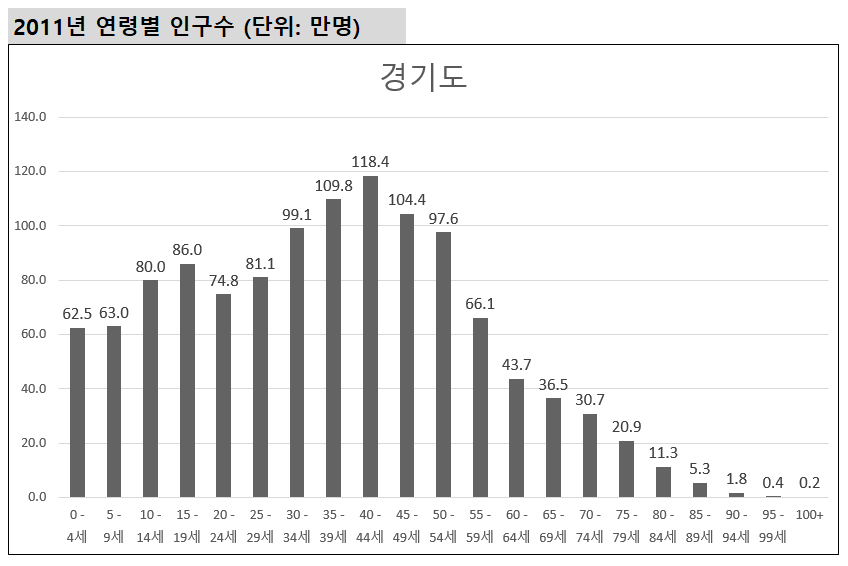 그럼 약 10년전인 2011년의 경기도 인구구조는 어떠했을까요?
