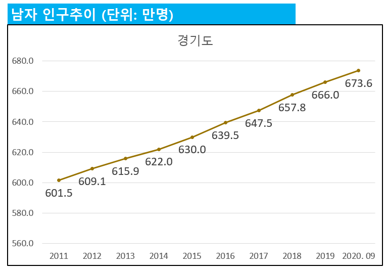 2011년 경기도 남자 인구수는 601.5만명이었으나, 2020년 현재 경기도 남자 인구는 673.6만명 까지 증가한 상황입니다.