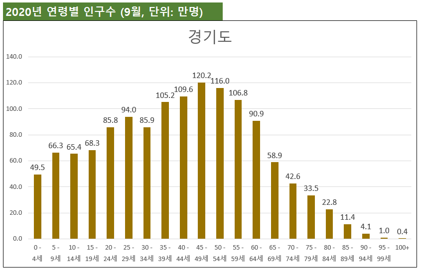 경기도의 연령대별 인구비중 수치를 보면, 경기도 또한 인구노령화 및 젊은 인구 감소 추세로 부터 자유로울 수 없음을 알 수 있습니다.
