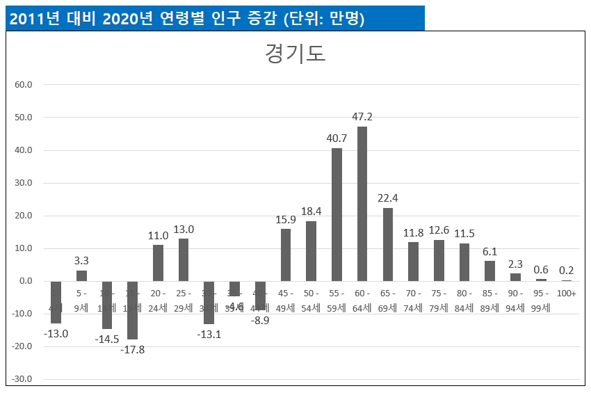 경기도의 2011년 대비 2020년 연령대별 인구수 변화를 보면 현재 우리사회가 처한 인구문제를 확실하게 알 수 있습니다.