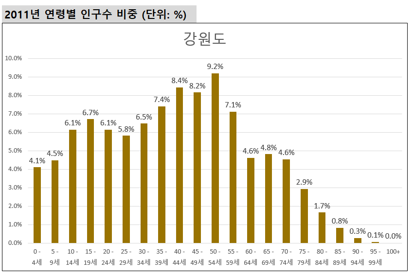 2011년 강원도의 연령별 인구수 비중을 보면 0~4세 인구비중은 4.1%, 5~9세 인구는 4.5% 였음을 알 수 있습니다.