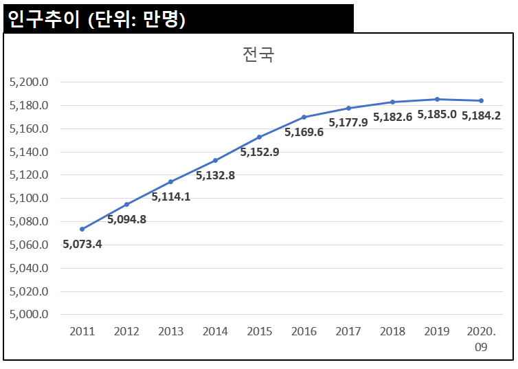 같은 기간 전국 인구수를 보면 2019년까지 지속적으로 증가하다가 2020년 부터 소폭 감소 추세로 돌아선 것을 알 수 있습니다.