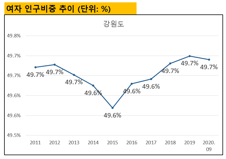 강원도에서 여자인구가 차지하는 비중은 2015년 49.6%까지 줄었다가 2020년 현재 49.7%로 소폭 증가한 상황입니다.
