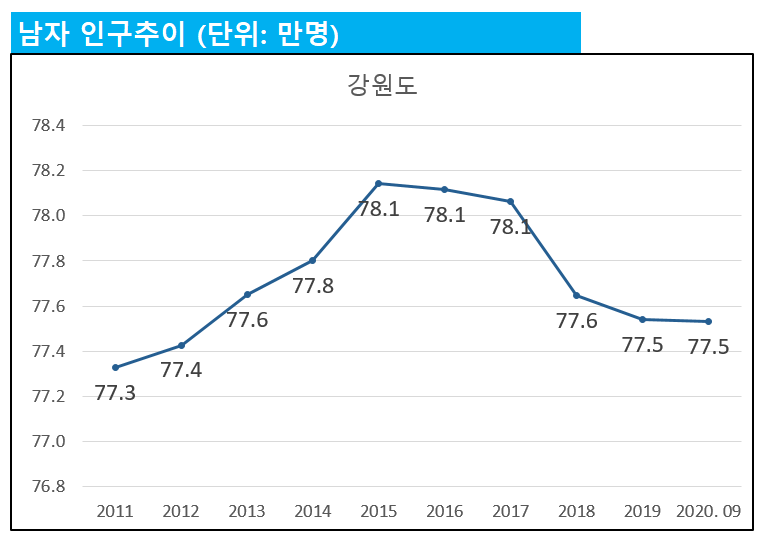 강원도의 총인구 증가가 2016년까지 진행된 것을 감안하면 강원도 남자 인구의 감소가 다소 빨리 시작된 편입니다.