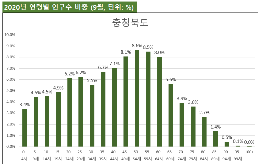 앞서 살펴본 성별 인구구조와는 다르게 연령별 인구구조의 경우에는 충청북도는 대체로 전국적인 평균과 유사한 수치들을 보이고 있습니다!