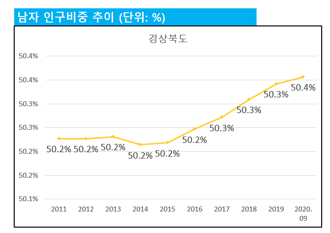 그런데, 경상북도의 남자 인구수 비중을 보면 2011년 50.2% 이던 것이 2020년 현재 50.4%로 소폭 증가하였습니다.