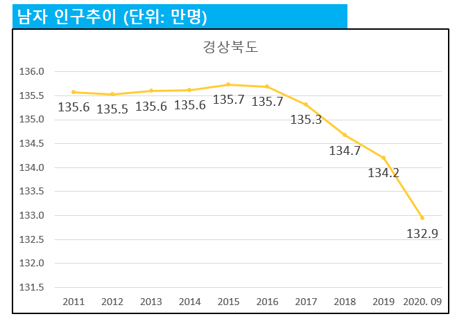 경북 남자 인구수는 2016년까지 135.7만명을 유지하다가 그 이후 2017년부터 빠르게 감소하고 있습니다.