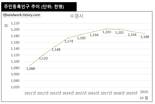 수원시 전체 인구는 2011년 108.8만명에서 꾸준히 증가하여 2017년 120.3만명까지 도달하였습니다.