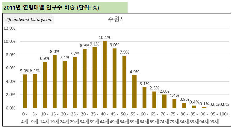 그럼, 2011년 수원시의 연령대별 인구구조는 어떠했을까요?