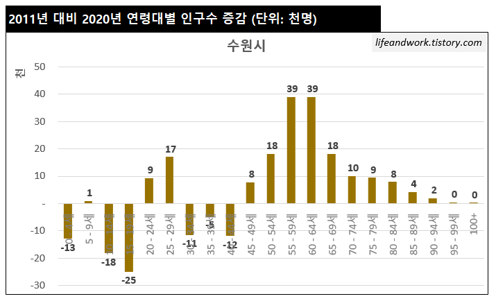 (3) 수원시 2011년 대비 2020년 연령별 인구수 변화.