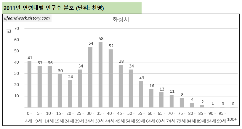 저출산 및 젊은 인구 감소로 인한 인구절벽 이슈가 2011년에도 전국적으로 심각하게 발생하고 있었지만, 화성시만 보면 상대적으로 매우 양호한 상황이었음을 알 수 있습니다.
