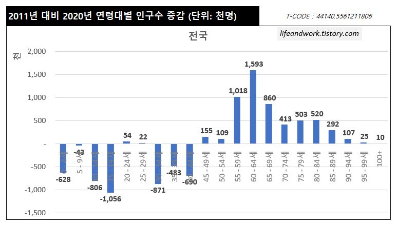 바로 아래에 있는 대한민국 전체의 2011년 대비 2020년의 연령대별 인구증감 현황을 보면 명확하게 노인인구 증가 및 젊은 인구 감소로 요약할 수 있는데, 화성시는 예외적으로 젊은 층 중심의 인구증가가 매우 돋보입니다.