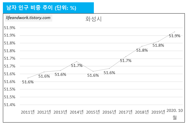 2011년 51.6%였던 화성 남자 인구 비중은 2020년 현재 51.9%까지 증가하였습니다.