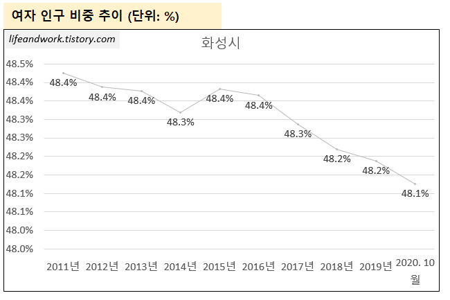 다만, 여자 인구수 비중은 지속 감소하여 2020년 현재 48.1% 수준입니다.