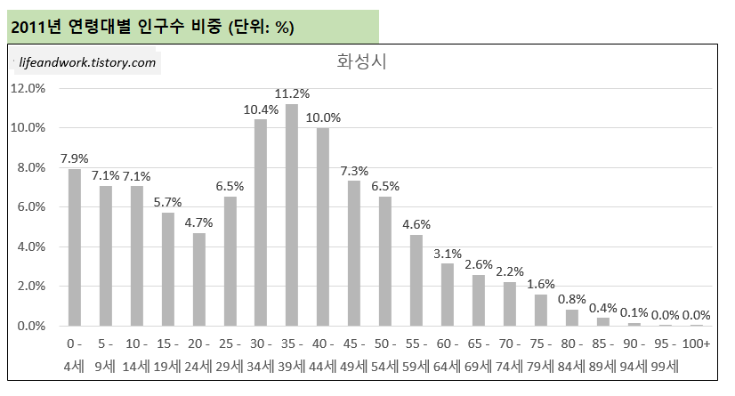 (2) 화성시 2011년 연령별 인구 추이 및 인구 비중.