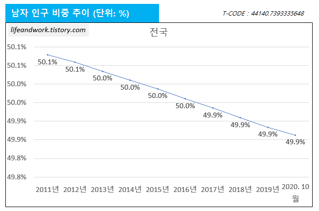 아래 그래프에서 처럼 전국의 남자 인구수 비중이 지속 감소하고있는 것에 비추어 보았을때 청주시의 남자 인구수 비중의 증가는 청주 지역만의 특성으로 이해할 수 있습니다.