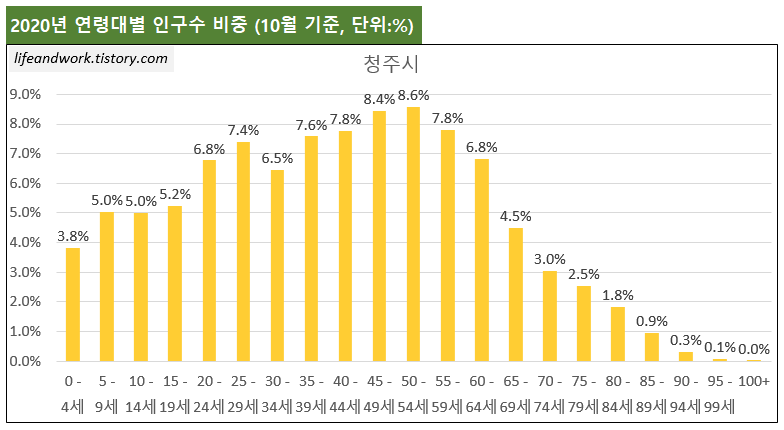 다만 위 그래프에서 보는 것 처럼 전국적으로 0~4세 인구수 비중이 3.3%, 5~9세 인구비중이 4.4%, 10~14세 인구비중이 4.5%에 불과한 것과 비교해 보았을때는 청주시의 어린 인구수 비중은 상대적으로 형편이 낳은 상황으로 보입니다.