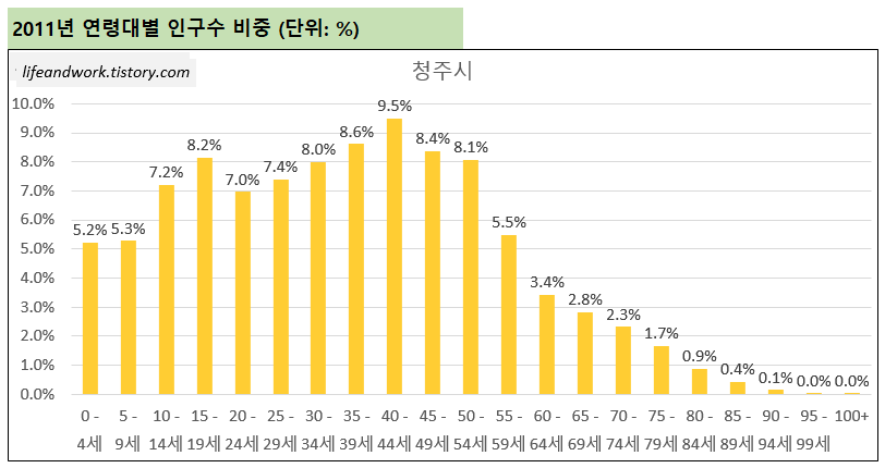 2011년 당시 청주시의 연령대별 인구수 및 인구 비중을 살펴보면 2011년 당시에도 젊은 인구의 감소추세가 확연하게 나타나고 있었음을 알 수 있습니다.